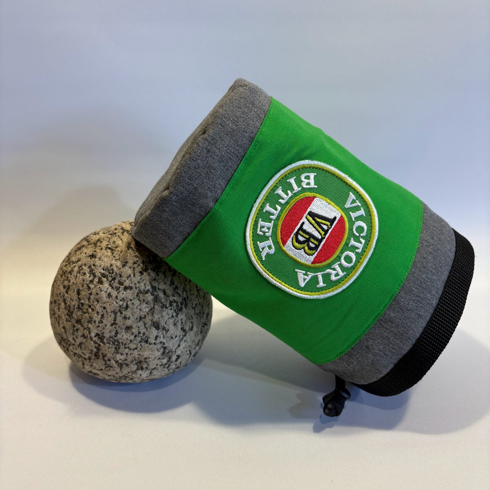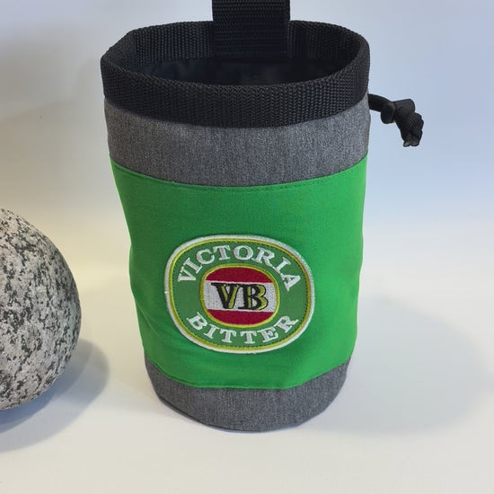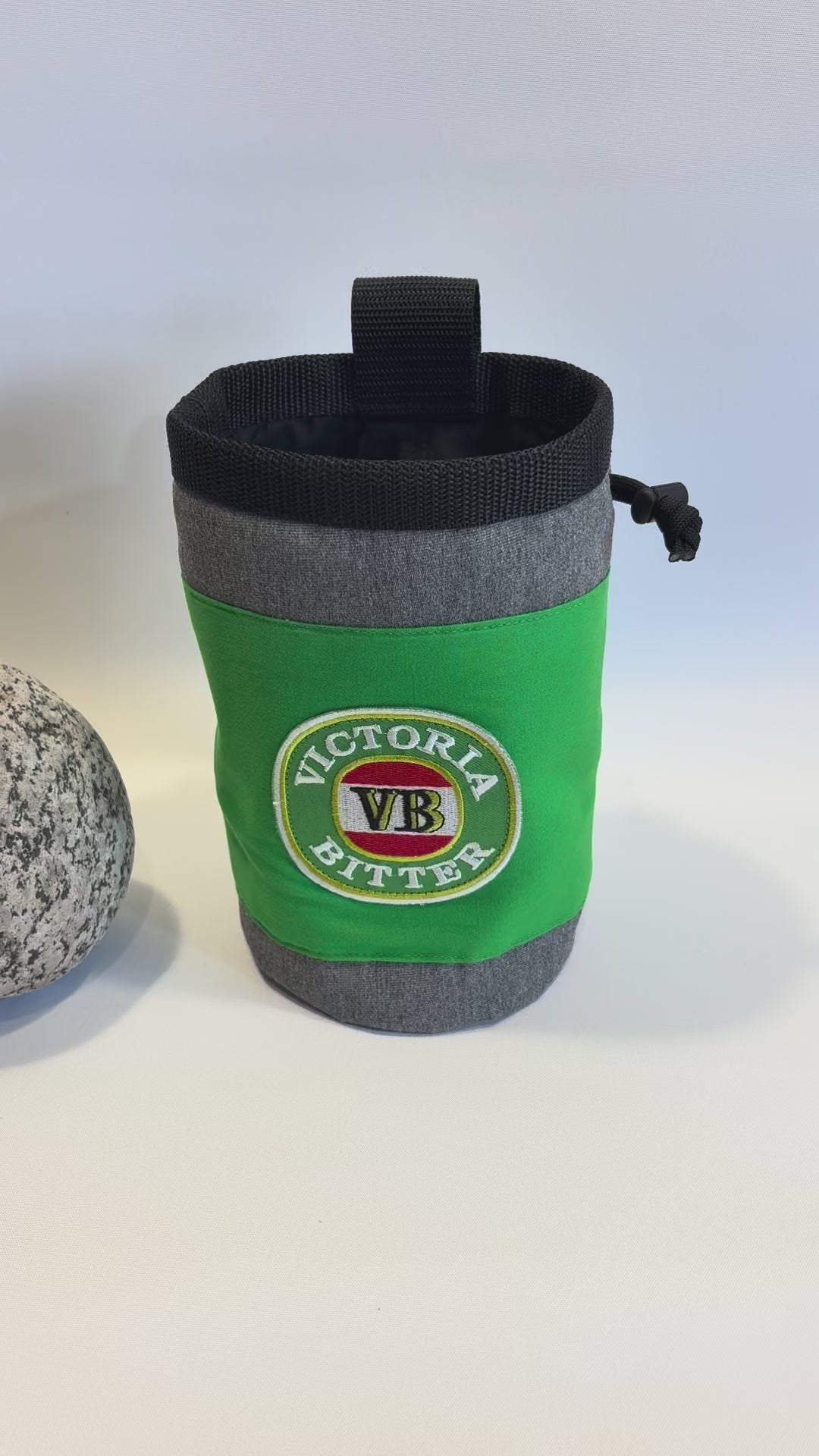 This chalk bag is made from heavy canvas, with a polar fleece inner. It has a polypropylene webbing rim and carabiner loop, and a polyester fabric and paracord drawstring closure. It is a nice roomy bag suitable for adult hands.