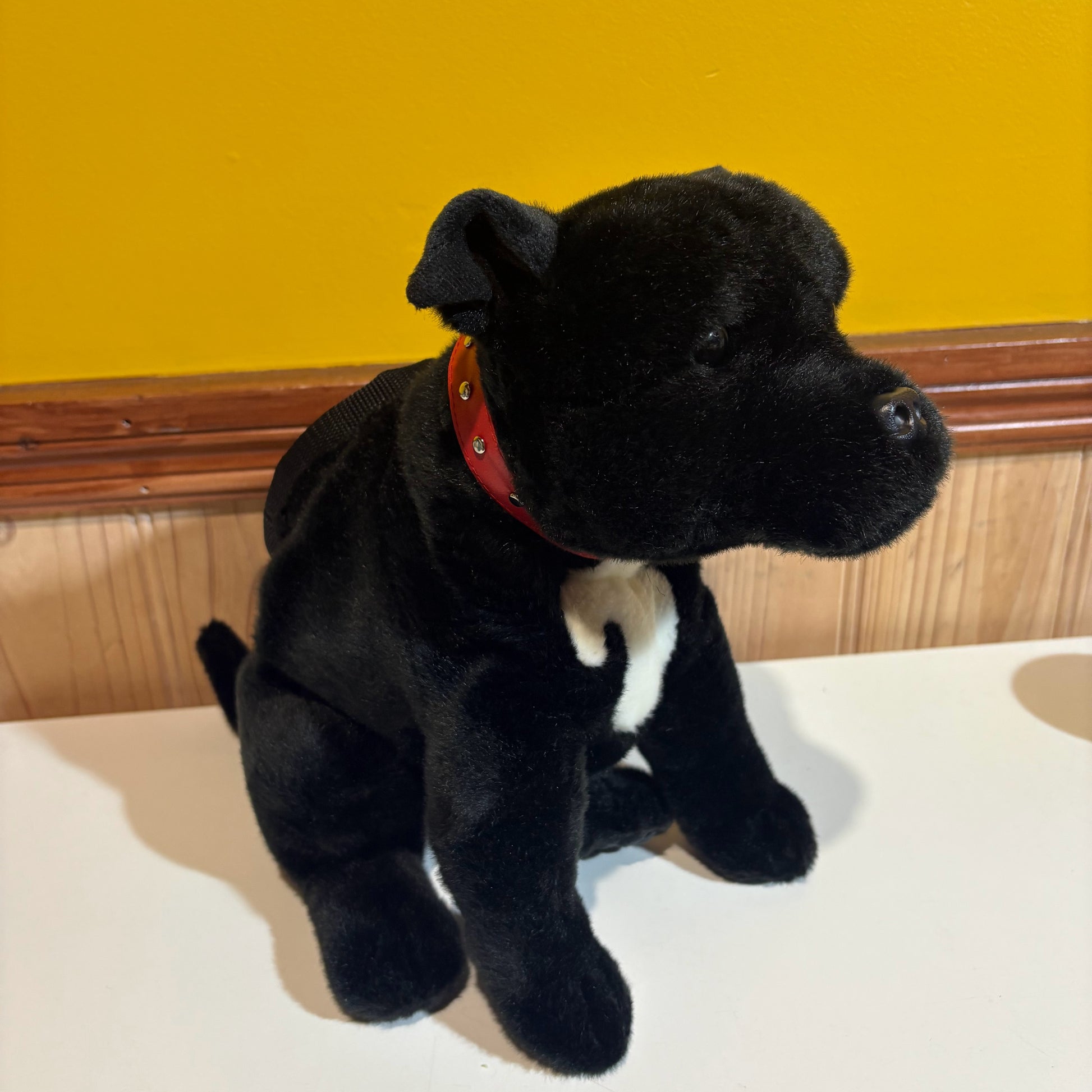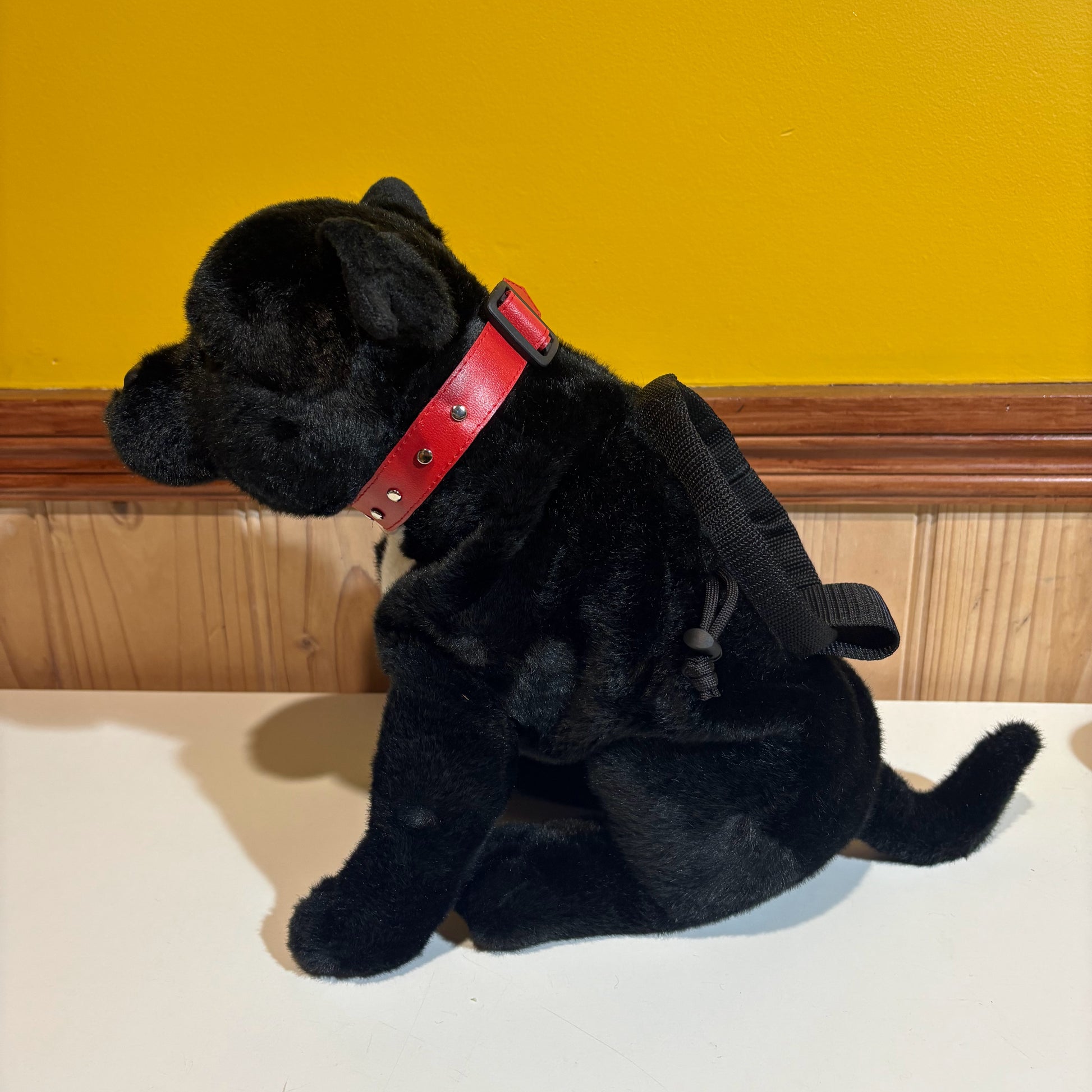 Made from a plush toy, with polar fleece inner bag, polyester fabric drawstring closure, polypropylene webbing rim.