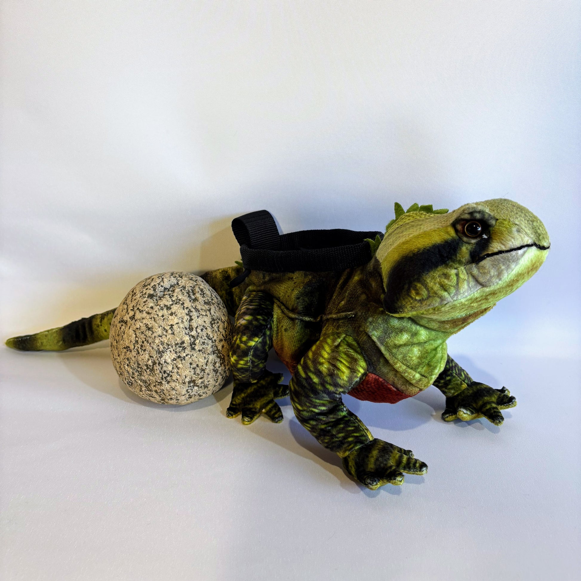 This Water Dragon Chalk Bag is made from a soft, cuddly plush toy. He has a polypropylene webbing rim and carabiner loop, polar fleece inner bag, and polyester fabric and parachute cord drawstring closure. This bag is suitable for adult hands.