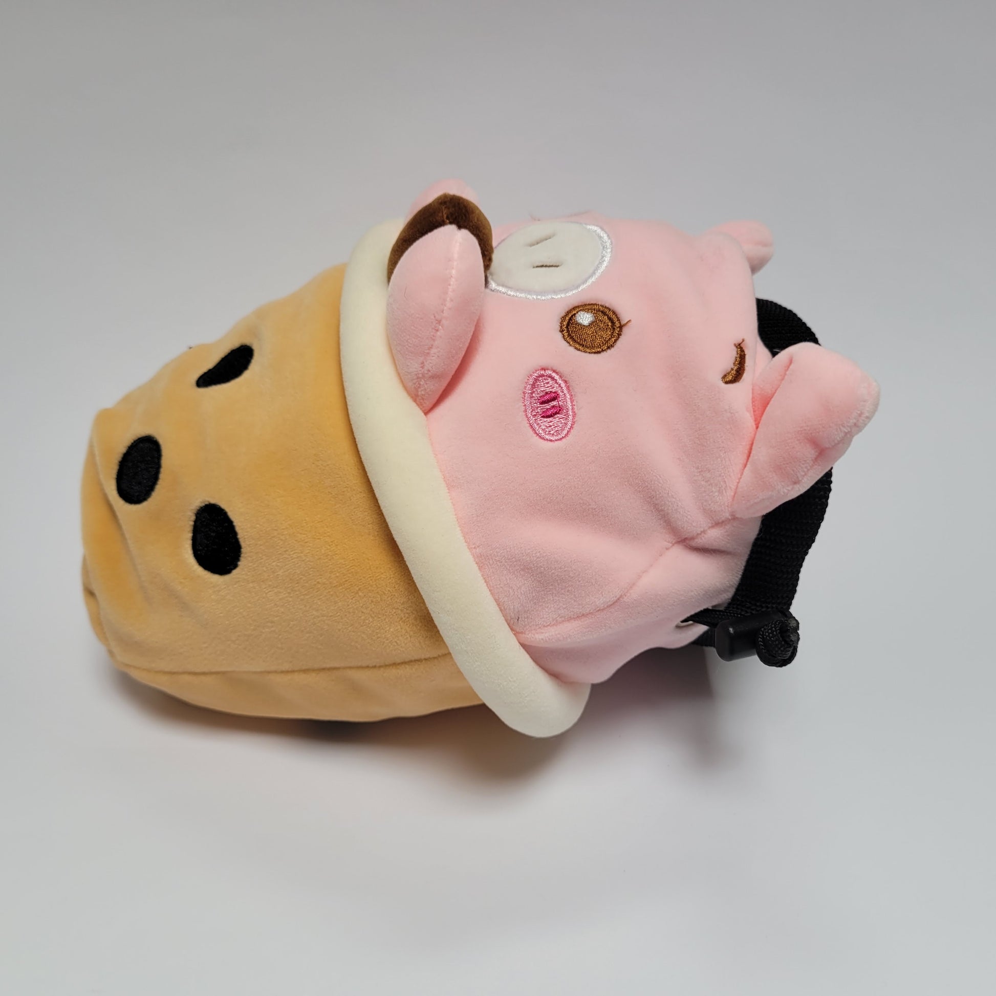 This so cute Boba Tea Pig Chalk Bag is made from a soft, cuddly plush toy. It has a polypropylene webbing rim and carabiner loop, polar fleece inner bag, and polyester fabric and parachute cord drawstring closure. This bag is suitable for adult hands.