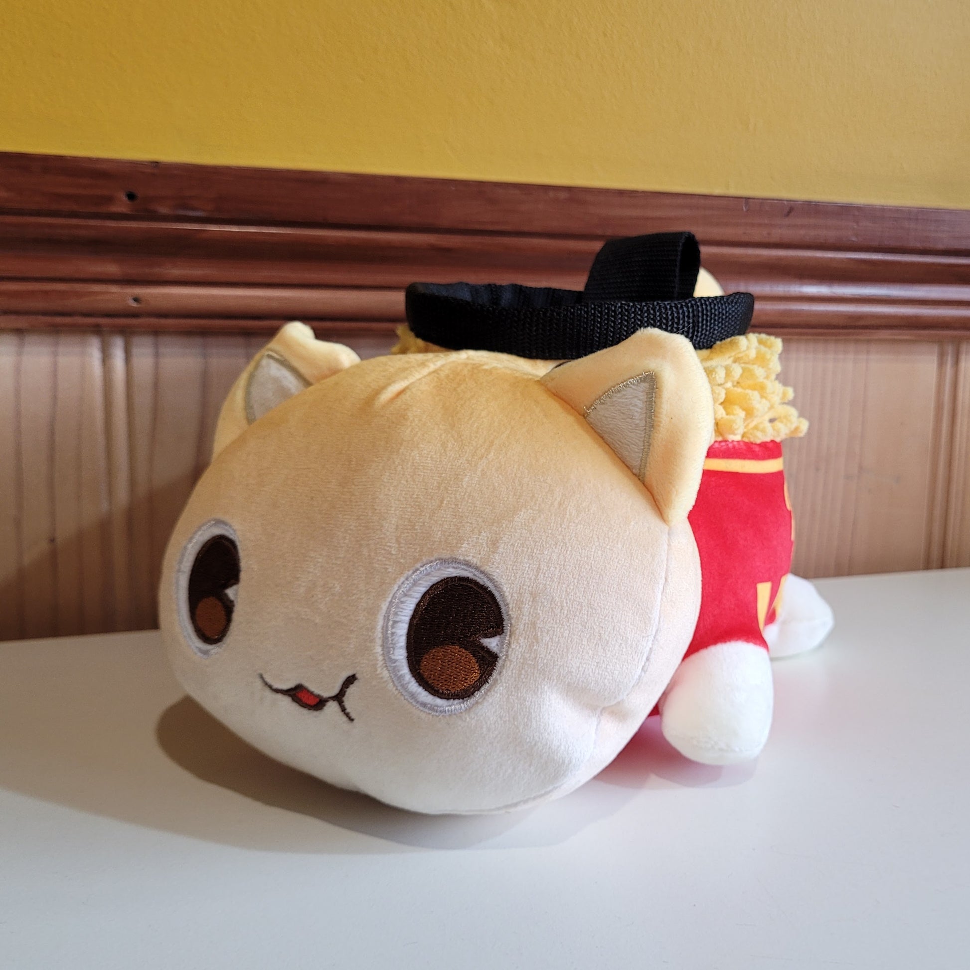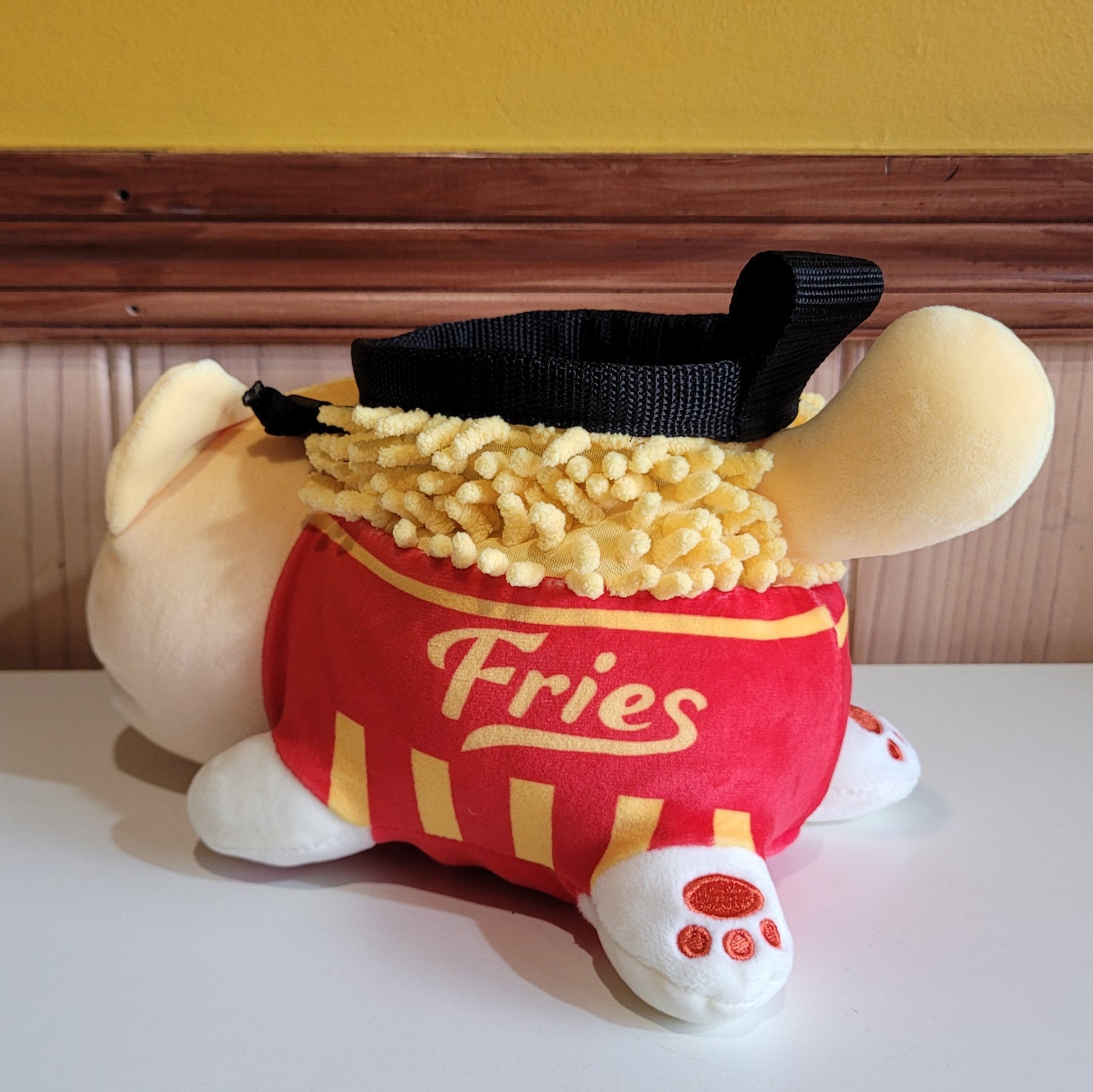This Fries Kitty Cat Chalk Bag is made from a soft, cuddly plush toy. It has a polypropylene webbing rim and carabiner loop, polar fleece inner bag, and polyester fabric and parachute cord drawstring closure. This bag is suitable for adult hands.